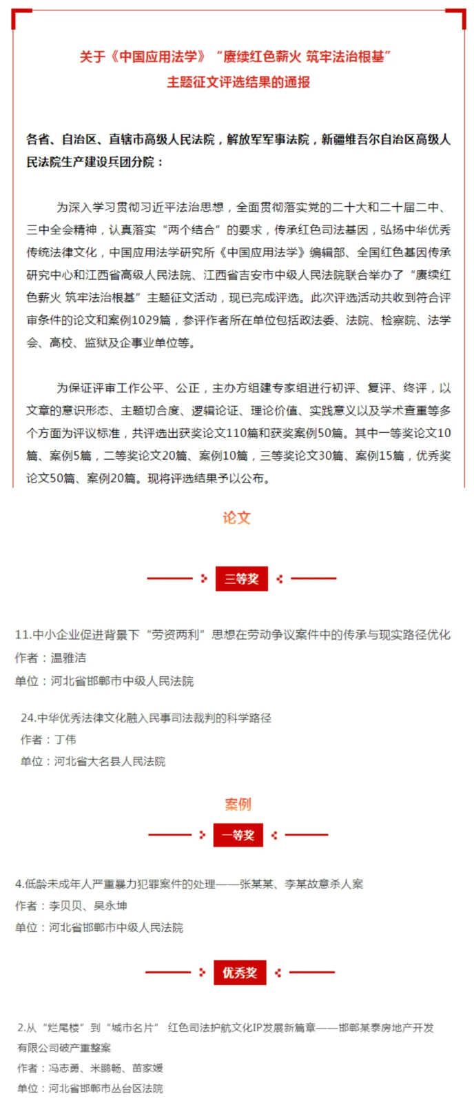 近日,最高人民法院《中国应用法学》“赓续红色薪火 筑牢法治根基”主题征文活动评选结果公布,邯郸法院4篇调研成果在本次活动中获奖: