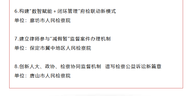 为深入学习贯彻党的二十大和二十届三中、四中全会精神,充分发挥改革典型事例引领、推动作用,推进检察改革在法治轨道上有序进行,省检察院于近日组织对全省各地检察机关推荐报送的20余项检察改革事例进行筛选,确定了8项2025年度检察改革典型事例。