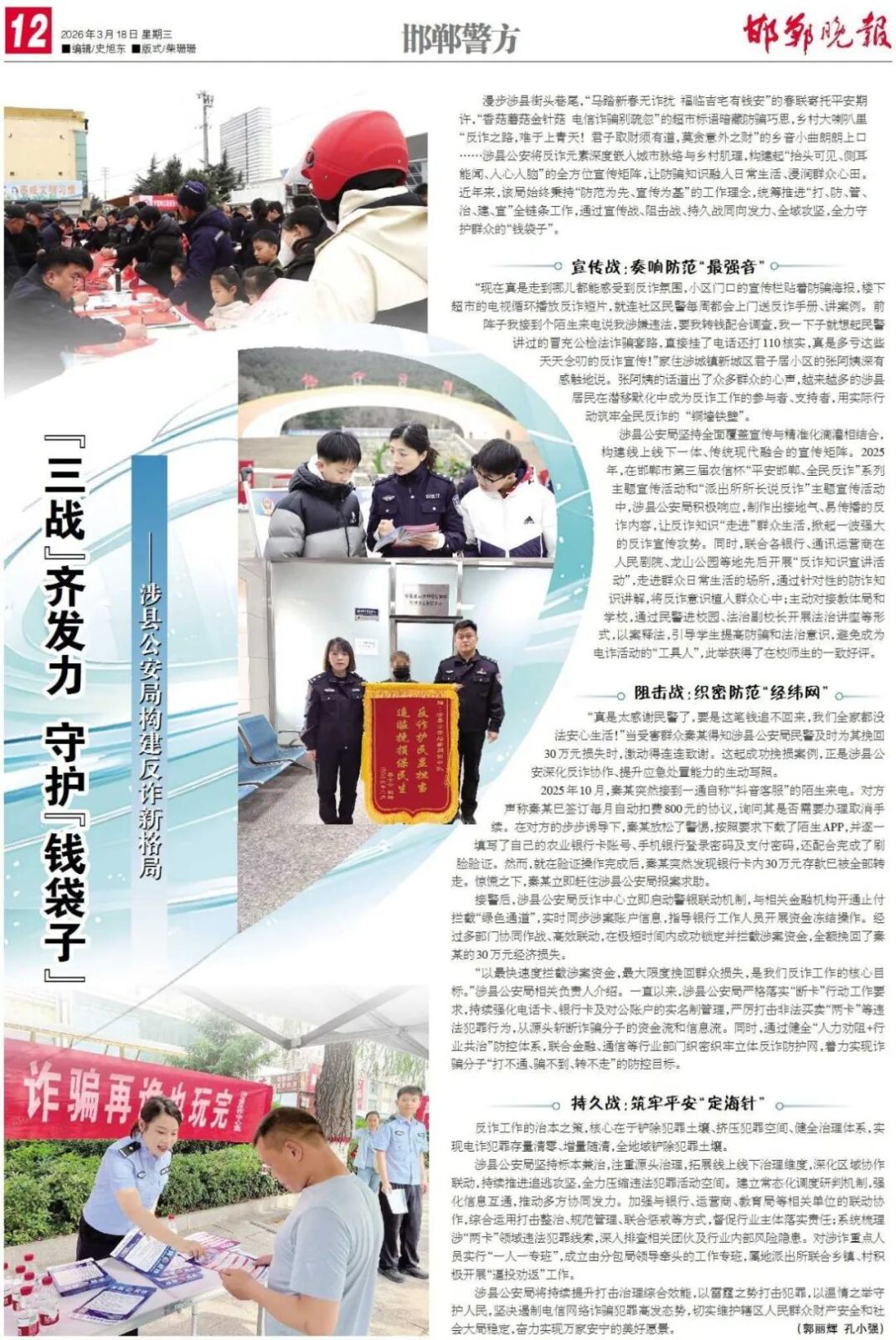 漫步涉县街头巷尾,“马踏新春无诈扰 福临吉宅有钱安”的春联寄托平安期许,“香菇蘑菇金针菇 电信诈骗别疏忽”的超市标语暗藏防骗巧思,乡村大喇叭里“反诈之路,难于上青天!君子取财须有道,莫贪意外之财”的乡音小曲朗朗上口……涉县公安将反诈元素深度嵌入城市脉络与乡村肌理,构建起“抬头可见、侧耳能闻、入心入脑”的全方位宣传矩阵,让防骗知识融入日常生活、浸润群众心田。近年来,该局始终秉持“防范为先、宣传为基”的工作理念,统筹推进“打、防、管、治、建、宣”全链条工作,通过宣传战、阻击战、持久战同向发力、全域攻坚,全力守护群众的“钱袋子”。