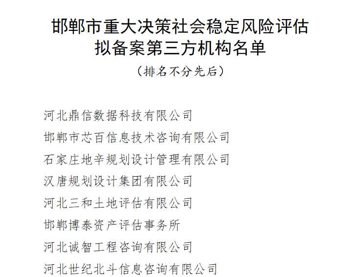 根据中共河北省委政法委《河北省重大决策社会稳定风险评估第三方机构管理办法(试行)》(冀政法〔2023〕28号)等文件规定,邯郸市委政法委组织开展了社会稳定风险评估第三方机构备案工作。经机构申请、部门审核,现对拟备案的第三方机构名单予以公示,公示期为5个工作日。