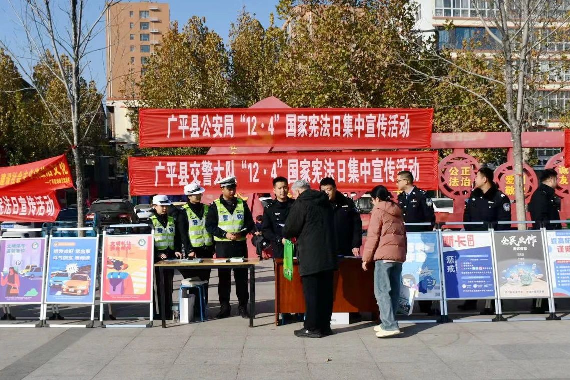 2023年12月4日是我国的第十个国家宪法日,为进一步增强群众学法用法意识,普及宪法常识,提高运用宪法维护合法权益能力,广平县公安局在文化广场集中开展宣传活动。县委常委、政法委书记薛振山出席活动并做重要讲话,政府副县长、公安局党委书记、局长杜学强致“ 12.4国家宪法日”活动开场词,并指导宣传工作。