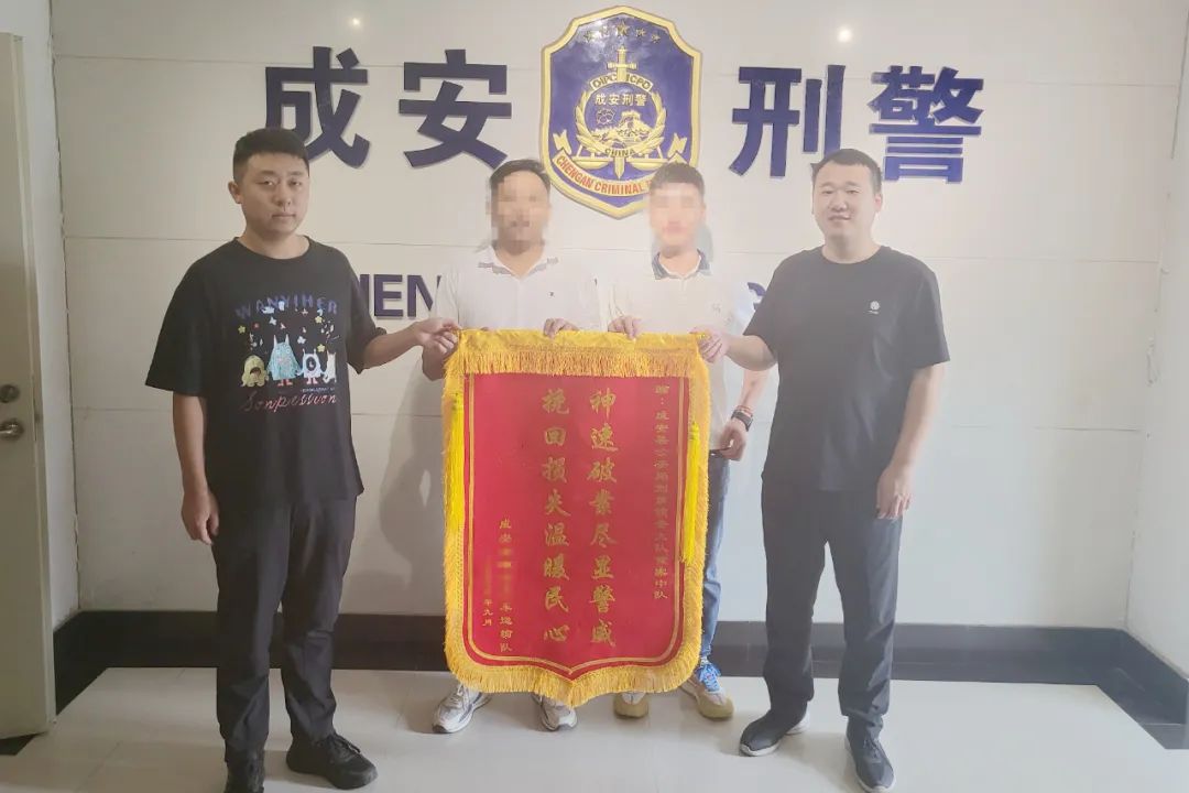 9月6日上午,成安县某运输公司经理冯某和员工王某涛将一面书有“神速破案尽显警威 挽回损失温暖民心”的大红锦旗送到刑事侦查大队重案中队民警手中,感谢他们护航企业发展,为自己公司挽回了重大损失。