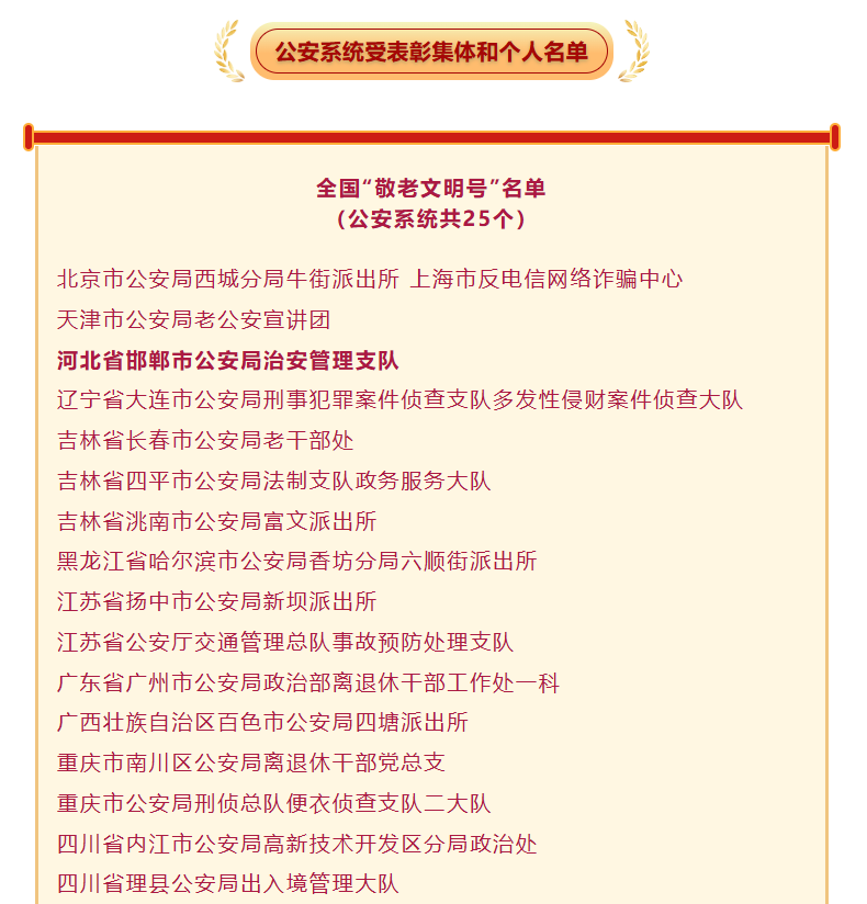 为表彰先进、树立榜样,进一步激励和动员全社会重视、支持和参与为老服务,营造敬老爱老助老社会氛围,根据全国老龄工作委员会办公室《关于开展2025年全国敬老爱老助老活动评选工作的通知》,经逐级推荐、审核和公示,授予北京市东城区东直门街道市民活动中心(党群活动中心)等1290个集体全国“敬老文明号”称号,授予高翔等1990名个人全国“敬老爱老助老模范人物”称号。其中,公安系统25个集体、29名个人获表彰。