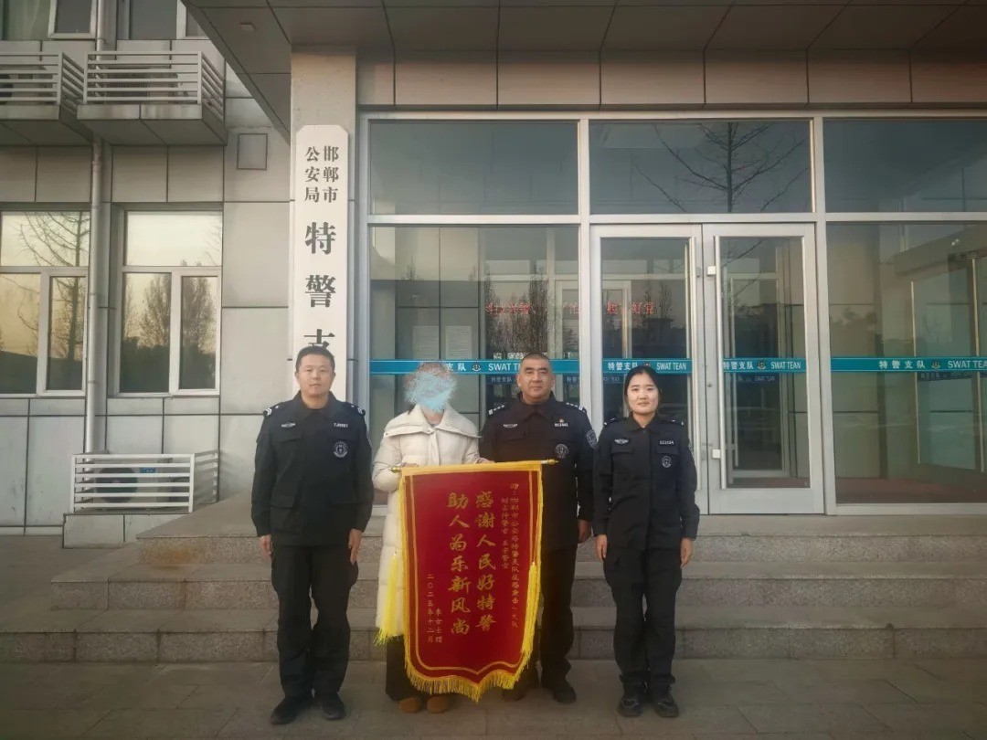 2025年11月27日下午13时许,果园路人和街交叉口发生了一起交通事故,在荀子二小护校执勤的刘占帅、王宇立即与指挥中心和事故科联系并拨打120,迅速将伤员送至医院救治。几天后,刘女士来到特警支队,将一面锦旗送到了民警手中 。