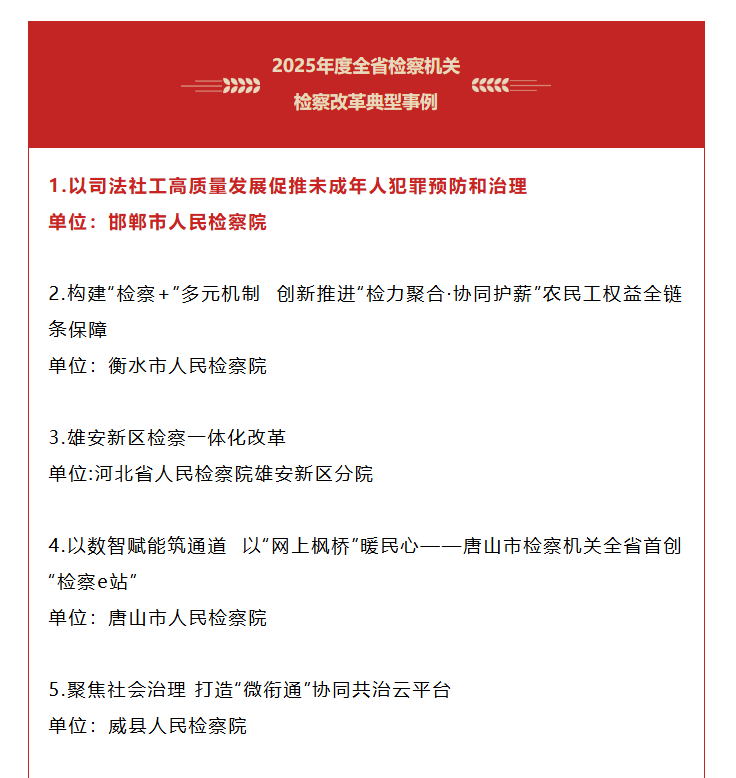 为深入学习贯彻党的二十大和二十届三中、四中全会精神,充分发挥改革典型事例引领、推动作用,推进检察改革在法治轨道上有序进行,省检察院于近日组织对全省各地检察机关推荐报送的20余项检察改革事例进行筛选,确定了8项2025年度检察改革典型事例。